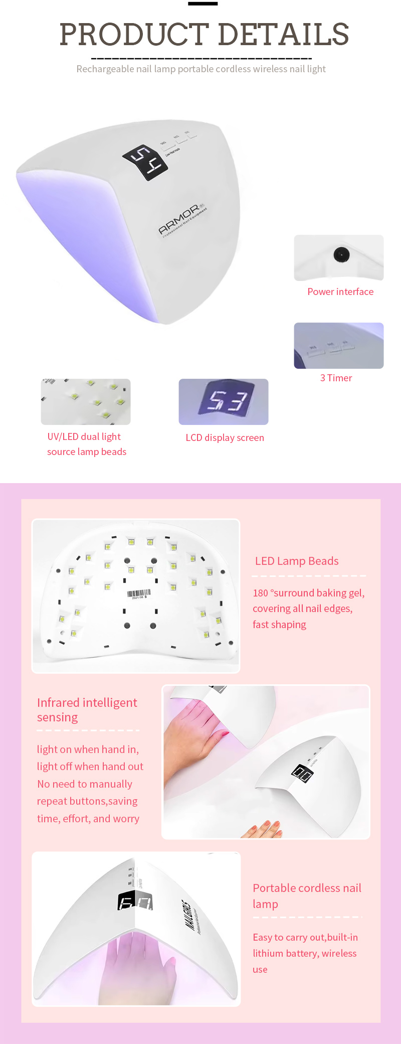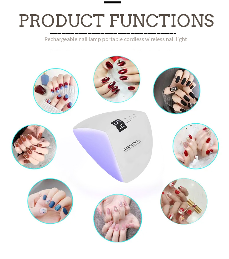 Produkt zapewnia równomierne wysychanie kleju bez skurczu. Podwójne źródła światła zapewniają delikatne ogrzewanie, aby zapobiec przebarwieniom dłoni i zmęczeniu oczu, odpowiednie zarówno dla dłoni, jak i stóp, zapewniając niezwykle szybkie rezultaty suszenia.