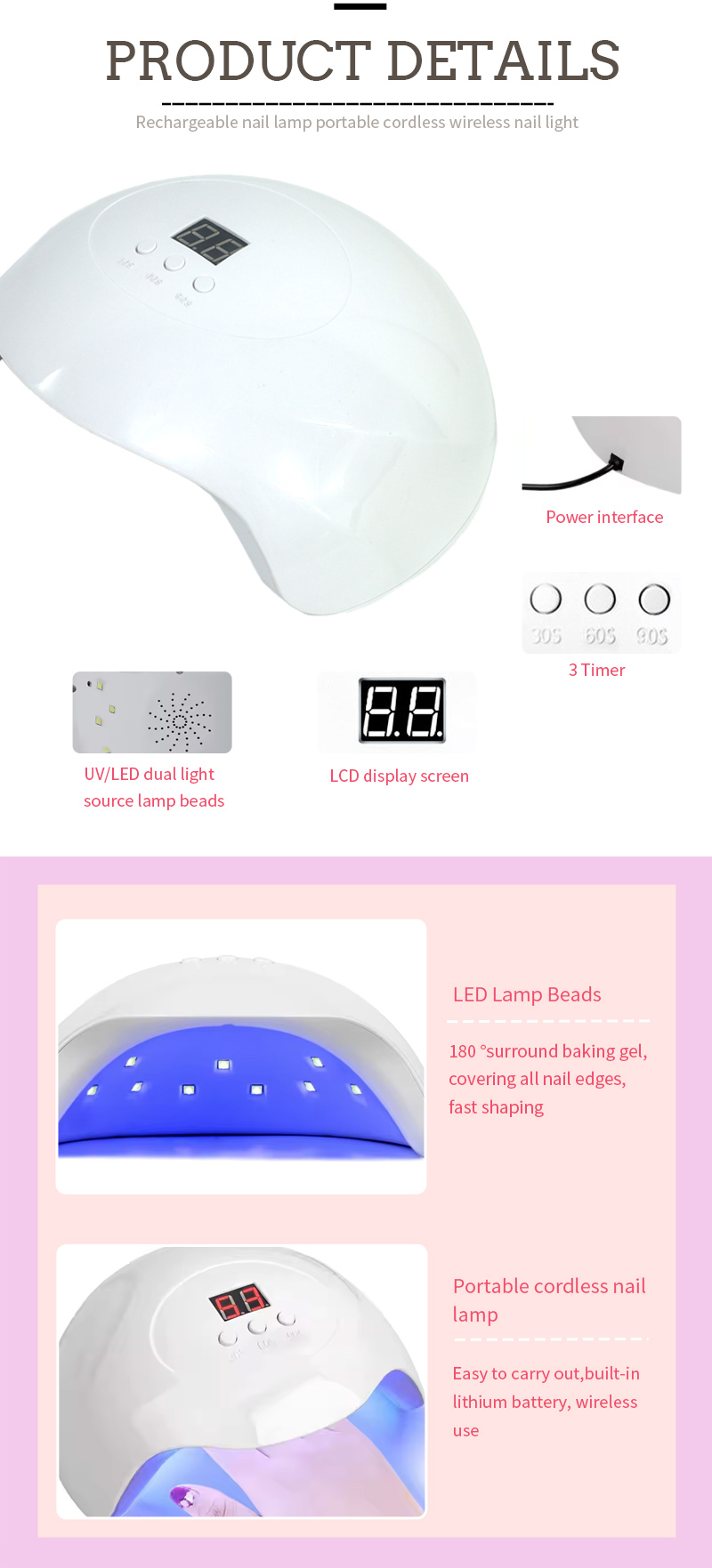 Produkt zapewnia równomierne wysychanie kleju bez skurczu. Podwójne źródła światła zapewniają delikatne ogrzewanie, aby zapobiec przebarwieniom dłoni i zmęczeniu oczu, odpowiednie zarówno dla dłoni, jak i stóp, zapewniając niezwykle szybkie rezultaty suszenia.