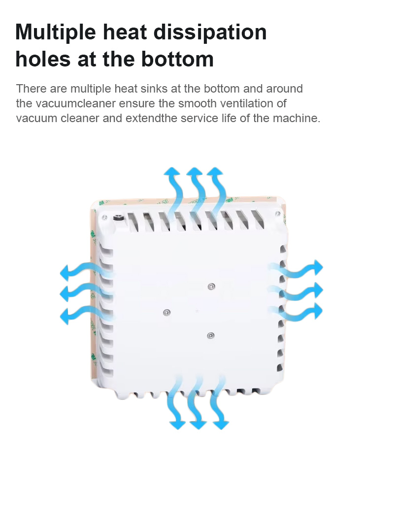 W dolnej części produktu znajdują się otwory chłodzące zapewniające płynną wentylację, a odkurzacz został zaprojektowany z wieloma otworami chłodzącymi na spodzie i dookoła, aby zapewnić płynną wentylację i wydłużyć żywotność urządzenia.