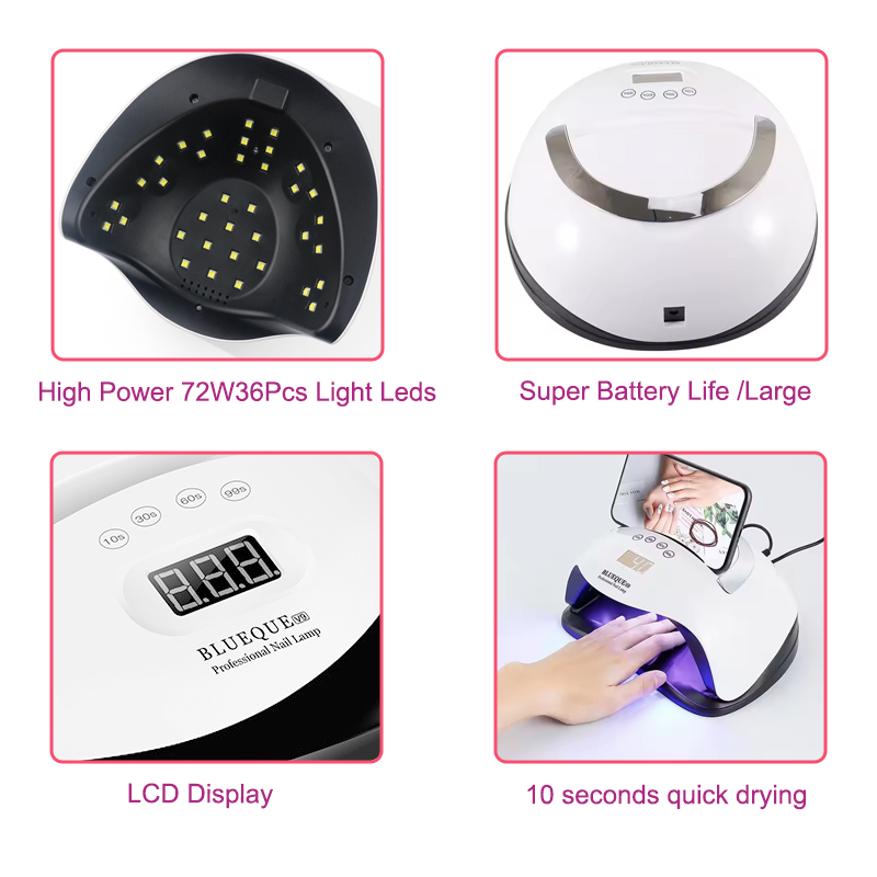 Wysokiej jakości lampa do paznokci z funkcją timera zapewnia równomierne wysychanie kleju bez skurczu. Podwójne źródła światła zapewniają delikatne ogrzewanie, aby zapobiec przebarwieniom dłoni i zmęczeniu oczu, odpowiednie zarówno dla dłoni, jak i stóp, zapewniając niezwykle szybkie rezultaty suszenia.