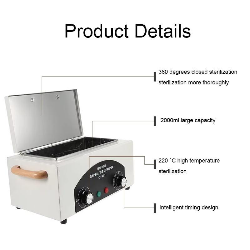 Sterylizator ten wytwarza ciepło głównie poprzez pierścień grzewczy, wykorzystując wysokie temperatury do dezynfekcji.
