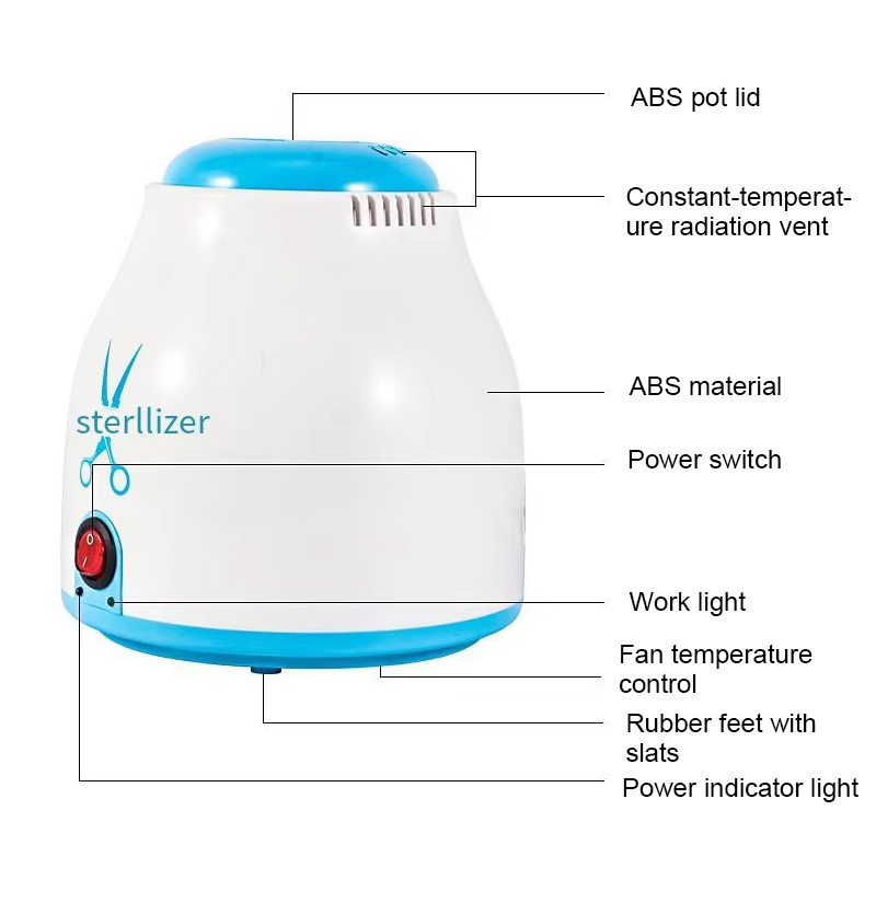 Sterylizator ten wytwarza ciepło głównie poprzez pierścień grzewczy, wykorzystując wysokie temperatury do dezynfekcji.