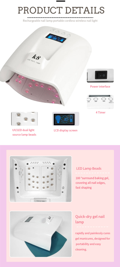 Lampa do suszenia paznokci o dużej pojemności z uchwytem zapewnia równomierne suszenie kleju bez skurczu. Podwójne źródła światła zapewniają delikatne ogrzewanie, aby zapobiec przebarwieniom dłoni i zmęczeniu oczu, odpowiednie zarówno dla dłoni, jak i stóp, zapewniając niezwykle szybkie rezultaty suszenia.