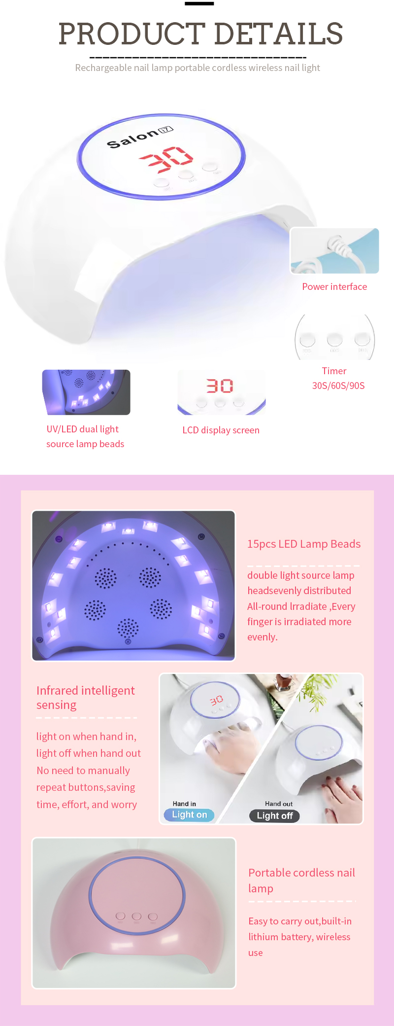 Produkt zapewnia równomierne wysychanie kleju bez skurczu. Podwójne źródła światła zapewniają delikatne ogrzewanie, aby zapobiec przebarwieniom dłoni i zmęczeniu oczu, odpowiednie zarówno dla dłoni, jak i stóp, zapewniając niezwykle szybkie rezultaty suszenia.