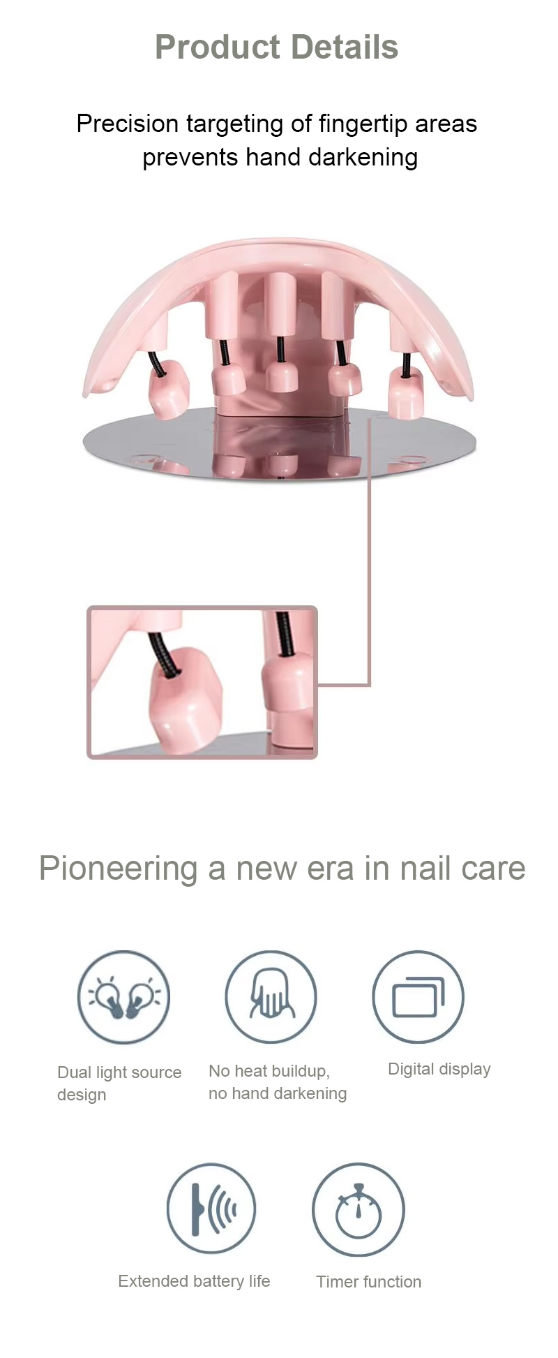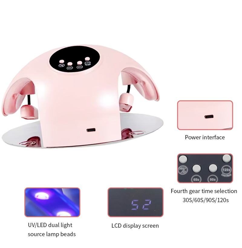 Produkt zapewnia równomierne wysychanie kleju bez skurczu. Podwójne źródła światła zapewniają delikatne ogrzewanie, aby zapobiec przebarwieniom dłoni i zmęczeniu oczu, odpowiednie zarówno dla dłoni, jak i stóp, zapewniając niezwykle szybkie rezultaty suszenia.