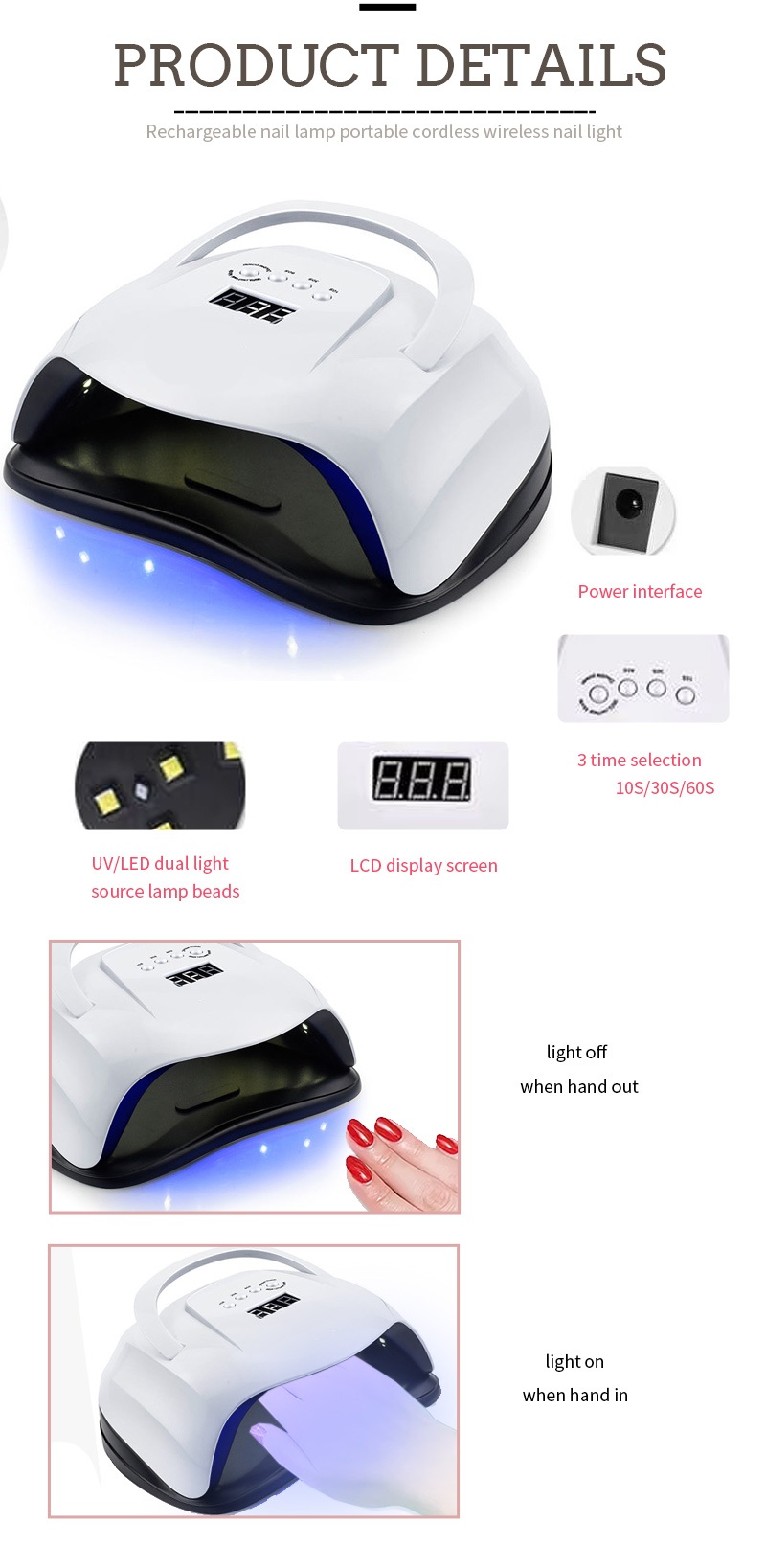 Przenośna lampa do suszenia paznokci jest wyposażona w inteligentną technologię wykrywania podczerwieni, która automatycznie włącza się, gdy dłonie się zbliżają, i wyłącza, gdy dłonie się oddalają, co eliminuje konieczność wielokrotnego naciskania przycisków i oszczędza czas i wysiłek. Klej do pieczenia o dużej mocy nie wymaga długiego oczekiwania, oszczędzając czas i wysiłek.