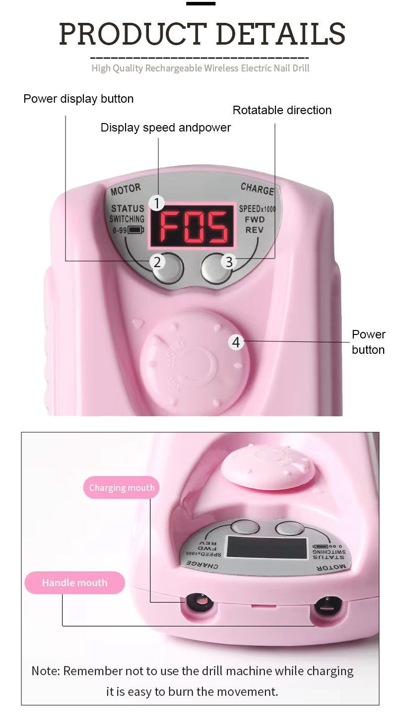 Wyświetlacz tej profesjonalnej bezprzewodowej elektrycznej wiertarki do paznokci ma włącznik/wyłącznik oraz obrót do przodu/do tyłu, co umożliwia w sumie aktywację jednym przyciskiem, gniazdo szybkiego ładowania na dole, wymienne gniazdo wiertarki na górze oraz trzypozycyjną regulowaną prędkość, aby spełnić różnorodne potrzeby.