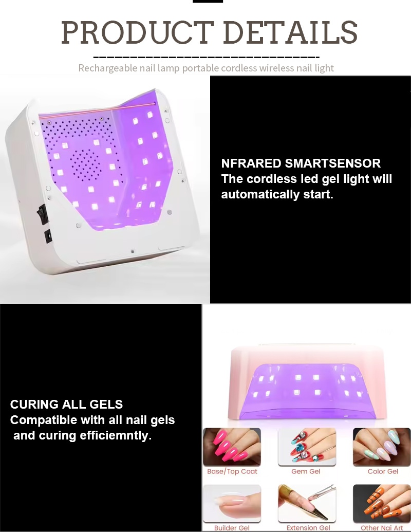 Kwadratowa lampa do suszenia paznokci jest wyposażona w inteligentną technologię wykrywania podczerwieni, która automatycznie włącza się, gdy dłonie się zbliżają, i wyłącza, gdy dłonie się oddalają, co eliminuje konieczność wielokrotnego naciskania przycisków i oszczędza czas i wysiłek. Klej do pieczenia o dużej mocy nie wymaga długiego oczekiwania, oszczędzając czas i wysiłek.