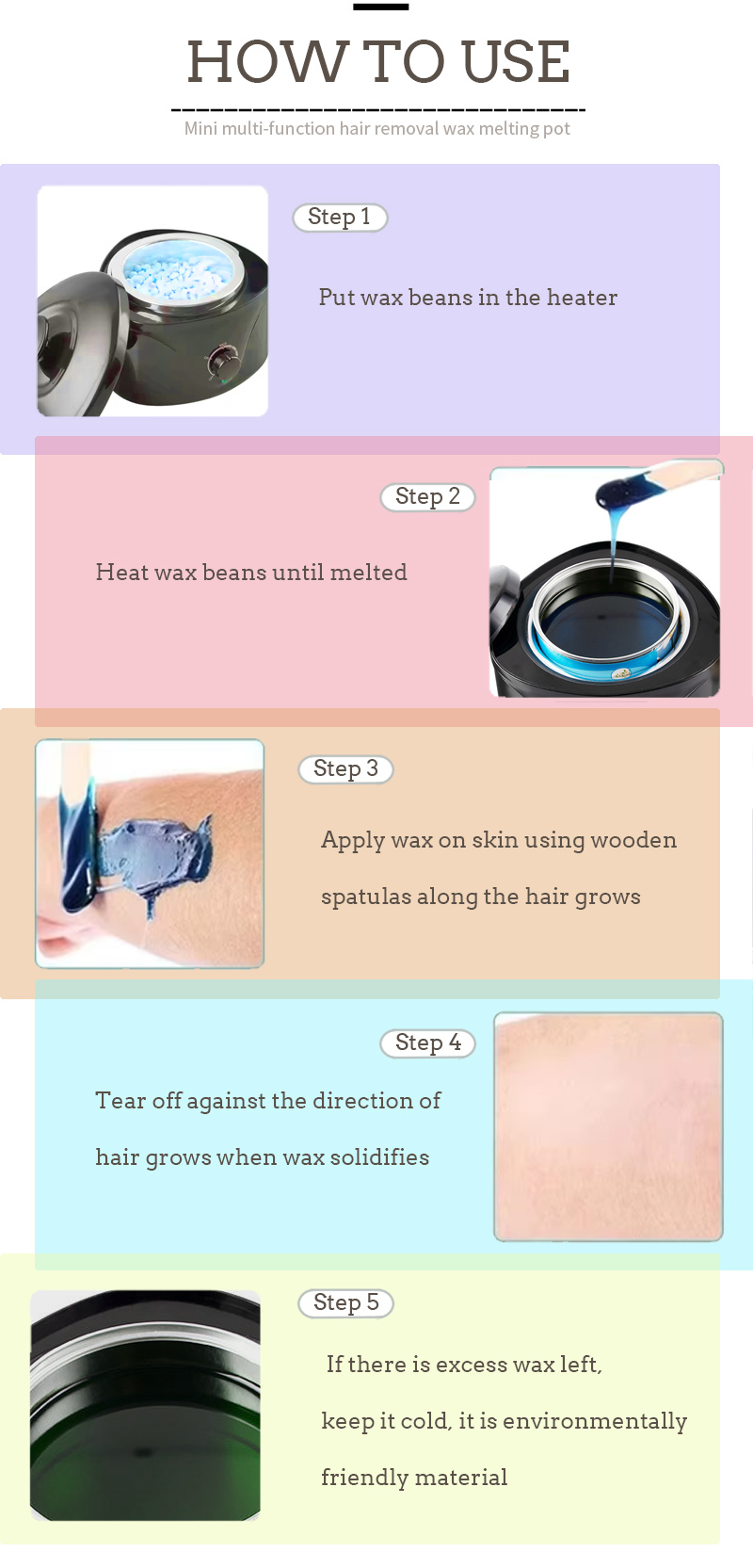 Metoda działania wosku do depilacji produktu, im wyższa temperatura, tym szybciej topi się wosk, im niższa temperatura, tym wolniej topi się wosk, najpierw wlać do odpowiedniej ilości ziaren wosku do depilacji, podgrzewać aż do stopienia ziaren wosku, następnie depilować części równomiernie pokrytego wosku do depilacji, a na koniec oderwać się w kierunku przeciwnym do kierunku wzrostu włosów.